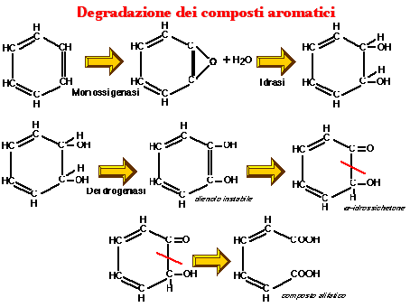 Con riferimento al catabolismo dei composti aromatici, la figura che segue ricorda gli eventi che portano alla rottura dell'anello aromatico.