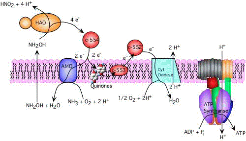 Nella figura successiva è mostrato il caso di Nitrosomonas, che ricava energia dalla ossidazione dell'ammoniaca ad acido nitroso, senza intervento di NAD+.